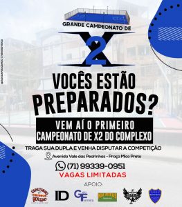 Tem início no próximo sábado, 18 setembro, na quadra da Praça Mico Preto, na Avenida Vale das Pedrinhas, o 1⁰ Campeonato de 2 contra 2 do Complexo do Nordeste Amaralina. Realizado pelo empresário, Frankn Santos, e tem o propósito de estimular a interação dos jovens da comunidade por meio do futebol.  Ao todo, 16 times irão competir, representando os mais diversos bairros da cidade.